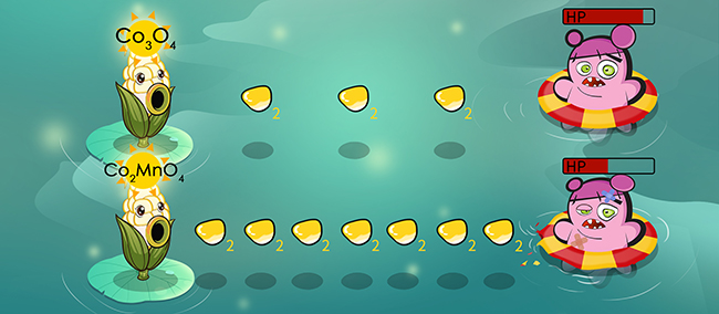 上方豌豆射手添加Co3O4,发射少量豌豆(代表氧气);下方豌豆射手添加Co2MnO4,可长时间、稳定、快速地发射豌豆,代表高效稳定地催化电解水反应