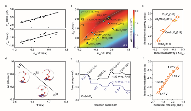 (a)中间物种吸附能的scaling关系;(b)OER活性截顶火山型曲线;(c)理论活性与实验的对比;(d)电荷外插值法计算电化学过程能垒;(e)不同电压下的反应能线图;(f)微观动力学模拟验证不同电压下理论活性的准确性。