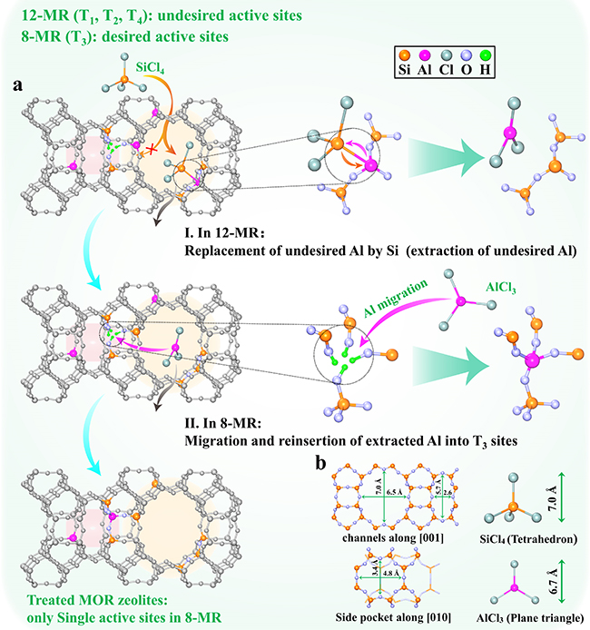 近日,中国科学院大连化学物理研究所低碳催化与工程研究部院士刘中民团队以典型的丝光沸石分子筛作为研究对象,通过设计一种低分压四氯化硅处理(LPST)的策略,实现了铝原子选择性地富集在丝光沸石骨架的T3位点上(位于8元环孔道)。利用该策略改性后的催化剂展现出优异的二甲醚羰基化反应性能。