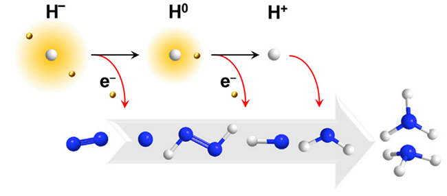 氢化物作为e-/H+载体,可以通过氢负离子(H-),氢原子(H0)和质子(H+)的相互转化参与氮气还原反应