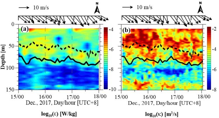 赤道142 E观测到的湍动能耗散率(左)和对应的跨等密度面混合系数(右)。图片上部箭头是风矢量,中间虚线是混合层底,实线为同温层底,两者之间是障碍层