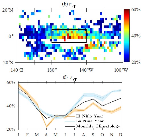 赤道太平洋障碍层混合发生现率的空间(上)和时间(下)变异规律
