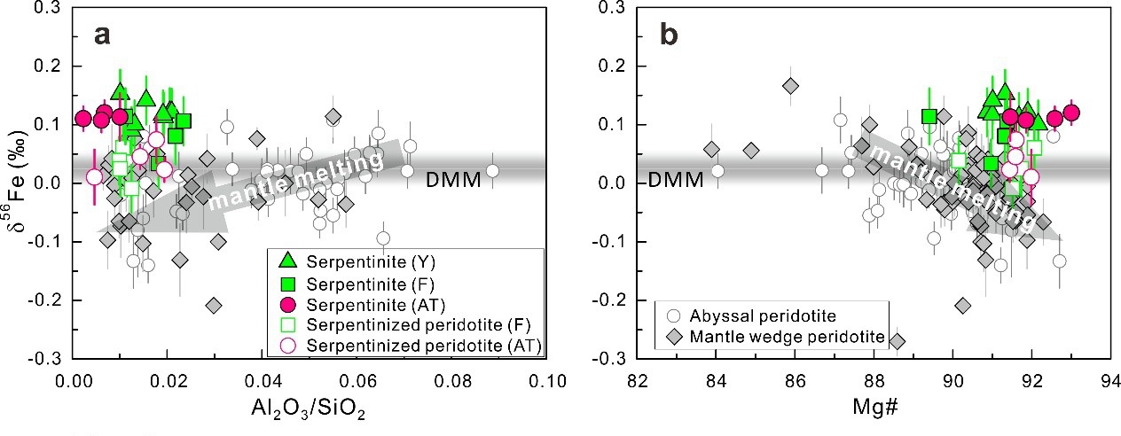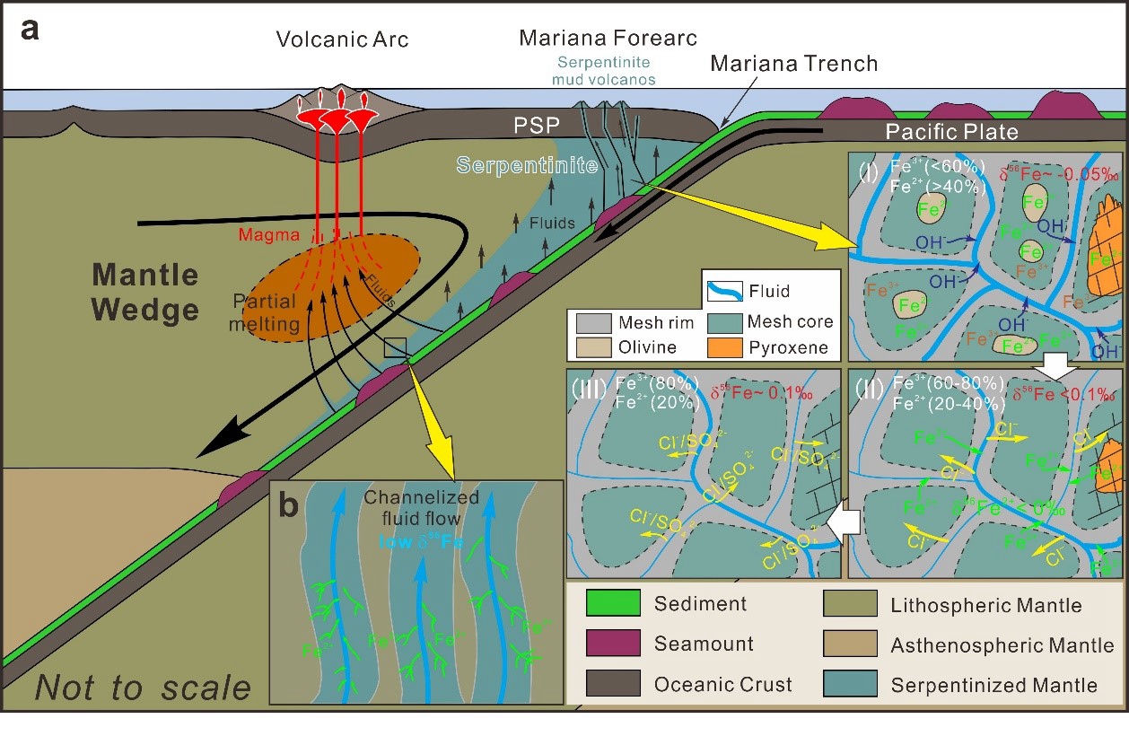 该研究的重要性在于发现了地幔楔蛇纹石化过程中显著的地幔氧化及Fe同位素分馏现象。基于以上结果,研究人员提出在俯冲带地幔楔底部的成熟蛇纹岩可以作为过滤层固定富重铁同位素的Fe3+,并释放轻铁同位素的Fe2+离子进入渗滤的板片流体(图3)。这些流体随后可迁移至上部地幔楔甚至地幔熔融区,进而影响岛弧岩浆的产生。这对于岛弧岩浆氧逸度及Fe同位素组成具有重要意义,即地幔楔蛇纹石化过程以及随后的一些地质过程(地幔楔蛇纹岩俯冲分解脱水)可能会导致岛弧地幔逐渐氧化并富集轻Fe同位素,这样的岛弧地幔部分熔融就会产生具有轻Fe同位素组成的氧化性岛弧岩浆。