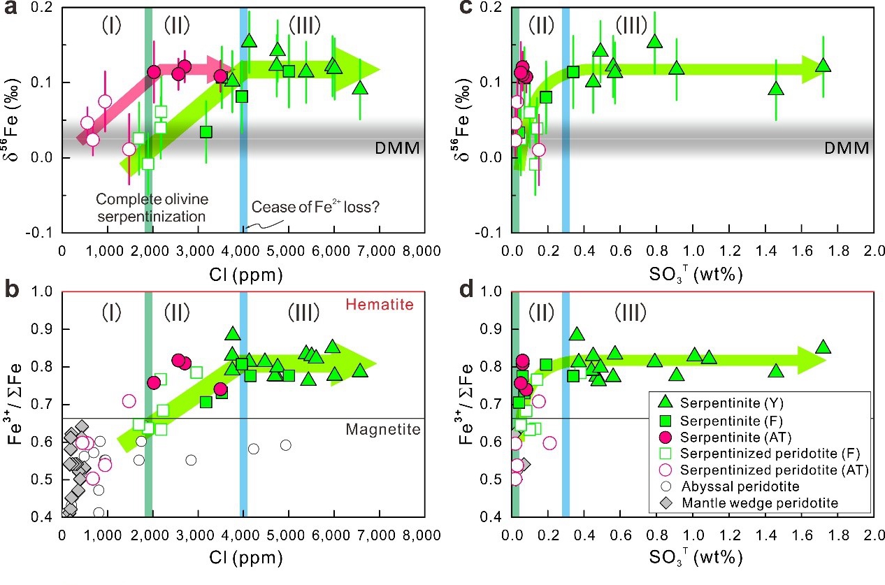 研究结果显示,这些地幔楔蛇纹岩发生了高度蛇纹石化至完全蛇纹石化,同时具有高的Cl和SO3含量。并且随着蛇纹石化程度增加,Cl和SO3含量均有增加的趋势。这些蛇纹岩的橄榄岩原岩十分亏损,但其Fe同位素组成却总体偏重( 56Fe, -0.01 – 0.15‰)(图1),明显高于橄榄岩原岩,说明地幔楔蛇纹石化过程发生了明显的Fe同位素分馏作用,导致蛇纹岩的Fe同位素逐渐变重( 56Fe增加)。这些蛇纹岩的Fe同位素组成( 56Fe)、Fe3+/ Fe与烧失量、Cl和SO3含量均表现出明显相关性(图2),结合其全岩Fe含量随烧失量升高轻微降低的特征,指示弧前地幔楔在富氯/硫酸根板片流体不断蛇纹石化的过程中发生了Fe2+的丢失以及显著的Fe同位素分馏。也就是说,具有轻Fe同位素组成的Fe2+随渗滤板片流体不断流失,导致残留的蛇纹岩Fe同位素组成变重,同时Fe3+/ Fe比值升高。马里亚纳弧前地幔楔蛇纹岩的高Fe3+/ Fe比值介于磁铁矿和赤铁矿之间,结合其高的SO3含量(图2),指示弧前蛇纹石化地幔楔具有很高的氧逸度。这样高氧逸度的弧前地幔楔蛇纹岩可沿俯冲隧道被俯冲板片拖拽到弧下地幔深度并分解释放氧化性流体,对岛弧岩浆的氧逸度产生重要影响。