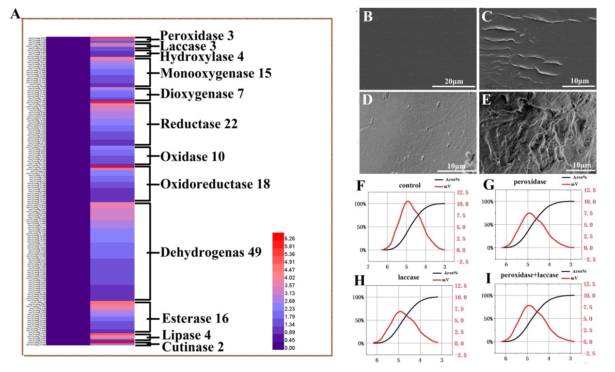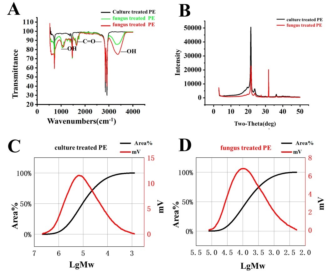 孙超岷团队自2016年开始从青岛近海采集了上千份塑料垃圾,经过大量筛选发现一个塑料垃圾上附着了一个海洋真菌Alternaria alternata FB1,该真菌在PE塑料表面具有很强的定殖能力。经过1个月左右的培养,该真菌能够在PE表面产生明显的降解孔洞。延长真菌处理PE的时间至4个月,该真菌能够使得塑料发生皱缩、变色,降解塑料碎片从原始塑料上剥离。研究人员进而结合红外光谱、凝胶渗透色谱、X射线衍射、高效液相色谱及质谱等手段多方位证实了该真菌能有效降解PE,解聚效率高达95%。结合气相色谱和质谱技术发现该真菌降解PE塑料的产物主要是一种四碳化合物(二甘醇胺,)占比达到93%。利用转录组技术解析了介导该真菌降解PE的潜在酶系,最终结合体外表达技术获得了多个在24小时内有降解PE效果的酶种。