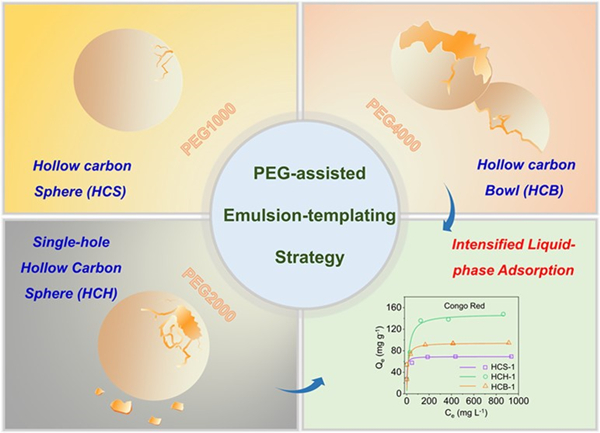 中空碳材料因其独特的空腔结构,高的比表面积及孔隙率等优点,在催化、吸附、储能和生物医学等领域有着广泛的应用前景。但是,中空碳材料的壳壁往往会阻碍大分子扩散,使空腔失去作用,极大限制了中空碳材料的性能及应用范围。近日,为了提高空腔的利用效率以及拓展中空碳材料的应用范围,青岛能源所王光辉研究员联合浙江工业大学朱艺涵教授开发了一种聚乙二醇(PEG)分子辅助的策略合成单开口中空碳球(HCH),并进一步研究了其在有机染料分子吸附过程中的性能及空间限域效应,相关研究结果发表在Chemistry of Materials《材料化学》杂志上。