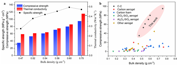图2. 高压辅助固化-常压干燥可实现较大密度范围轻质碳基复合材料的制备,其压缩强度显著高于文献报道的气凝胶和碳泡沫