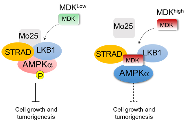此外,团队进一步探索了Midkine抑制AMPK的分子机制,确认了Midkine可以通过AMPK的上游激酶LKB1来调控AMPK的活性。一般情况下,LKB1通过与STRAD和Mo25形成异源三聚体,从而发生多位点自磷酸化并进行激活。而本工作中,研究人员发现Midkine可以直接结合LKB1和STRAD蛋白,从而抑制LKB1-STRAD-Mo25蛋白复合体的形成,进而抑制了AMPK的激活。研究人员进一步通过基因编辑手段及细胞生物学实验发现,通过Midkine调控LKB1-AMPK通路后能够促进癌症细胞增殖。临床数据分析显示,Midkine表达水平与AMPK的活性及病人生存率呈现负相关,证明了Midkine通过抑制LKB1-AMPK通路促进癌症的发展。本工作为全面解析Midkine的功能提供了新方向,也为Midkine的临床转化应用提供了新思路。