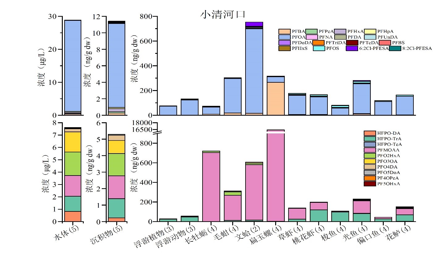 本研究在受工业污染较重的小清河口采集了水、沉积物和浮游生物、底栖动物和游泳动物在内的食物网样品,分析了新型及传统全氟化合物的生物富集特征及食物链传递规律,评估了当地居民摄入鱼、虾、螺、贝等主要海产品的健康风险。小清河河口水体和沉积物中以全氟辛酸(PFOA)、全氟2-甲氧基乙酸(PFMOAA)、全氟-3,5-二氧杂己酸(PFO2HxA)和六氟环氧丙烷三聚体羧酸(HFPO-TrA)为主要污染物(图1)。。生物体内∑PFAS的浓度排序为:腹足类 > 双壳类 > 甲壳类 > 鱼类 > 浮游生物,这可能与生物的食性、生物累积能力、栖息环境和生理状态的差异以及体内代谢转化有关。底栖无脊椎动物主要富集短链PFAS(PFOA、PFMOAA和PFBA),而鱼体内以长链PFAS(HFPO-TrA、 HFPO-TeA、PFO5DoA和PFOS)为主。