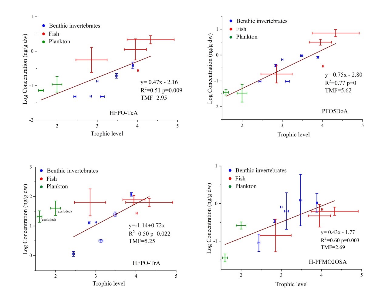 对PFAS的在河口食物网不同营养级生物间的传递规律研究表明:长链PFECAs(HFPO-TrA、HFPO-TeA、PFO5DoA)在生物体中的浓度随着营养级的增加而呈线性增加的趋势,表现出生物放大特性(图3);对于一些短链物质如PFMOAA、PFO2HxA和PFBA,在营养级相对较高的鱼类中浓度较低,但在营养级较低的软体动物中却浓度比较高,在生物体中的浓度随着营养级的增加而降低,表现出生物稀释效应。