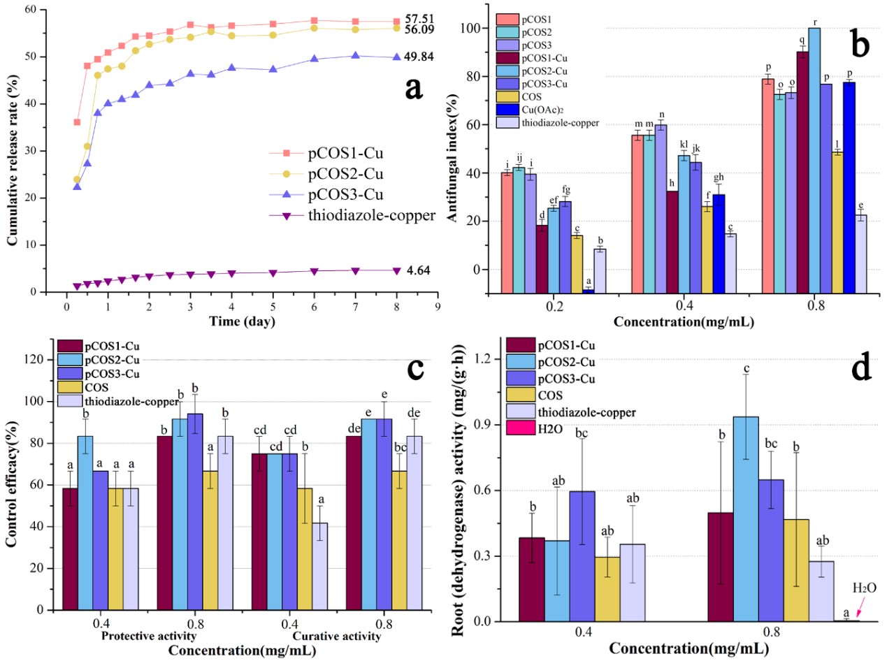 李鹏程课题组多年来致力于海洋生物资源在农业方面的应用研究,通过在壳寡糖配体中构建共轭系统,团队制得了一系列缓释性能、抗菌活性各异的壳寡糖铜配合物pCOSx-Cu。研究表明,壳寡糖配体中形成了p- - 共轭体系,导致pCOSx-Cu中吡啶基的氮原子与Cu2+形成了一个具有缓释能力的配位键,且Cu2+的累计释放速率与吡啶基的给电子能力呈正相关关系。经过体外及盆栽实验筛选,团队发现,以异烟酰氯盐酸盐修饰的配合物pCOS2-Cu对辣椒疫霉Phytophthora capsici Leonian具有最强的抗真菌活性,当浓度为0.8 mg/mL时,即可完全抑制菌丝生长。与商品化铜制剂噻菌铜相比,pCOSx-Cu具有更好的抗真菌活性、更低的毒性和更低的铜含量。此外,由于壳寡糖的引入,pCOSx-Cu还可以增强辣椒幼苗的根系活力。研究结果为海洋生物大分子铜制剂的深入研究奠定了基础,并表明在壳寡糖分子内构建共轭体系是调控其配合物缓释能力的有效策略。