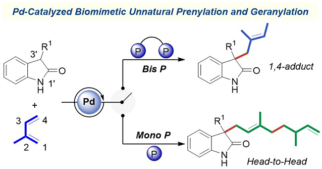 近日,中国科学院大连化学物理研究所仿生催化合成研究组研究员陈庆安团队在钯催化吲哚酮戊烯基化和类香叶基化方面取得新进展,利用双膦配体或单膦配体,改变金属钯中心的配位数,实现在吲哚酮上引入C5或者C10结构单元。该策略为在吲哚酮骨架分子上引入不同长度的异戊二烯链研究提供了新思路。