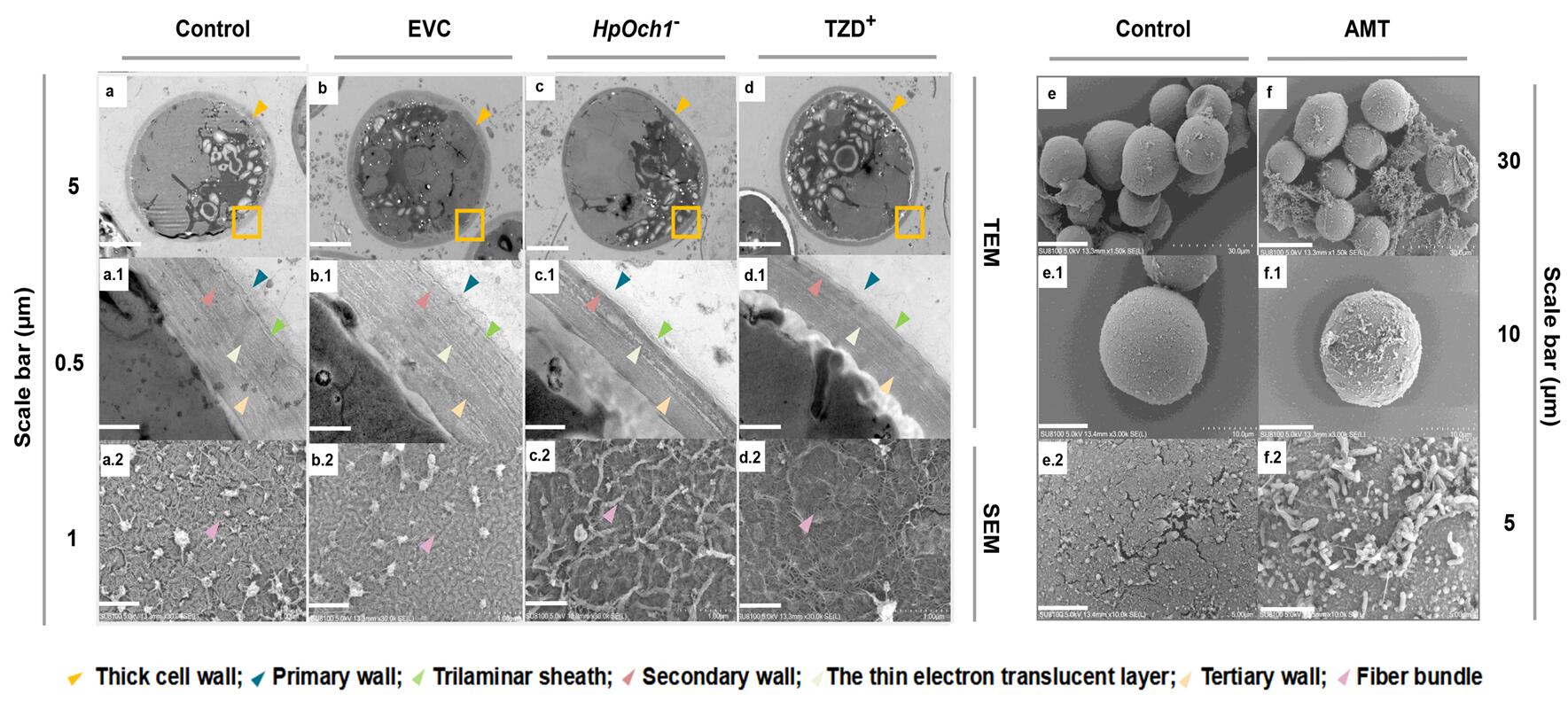 不同处理的雨生红球藻细胞壁增厚的电镜图片(左,透射电镜;右,扫描电镜)。