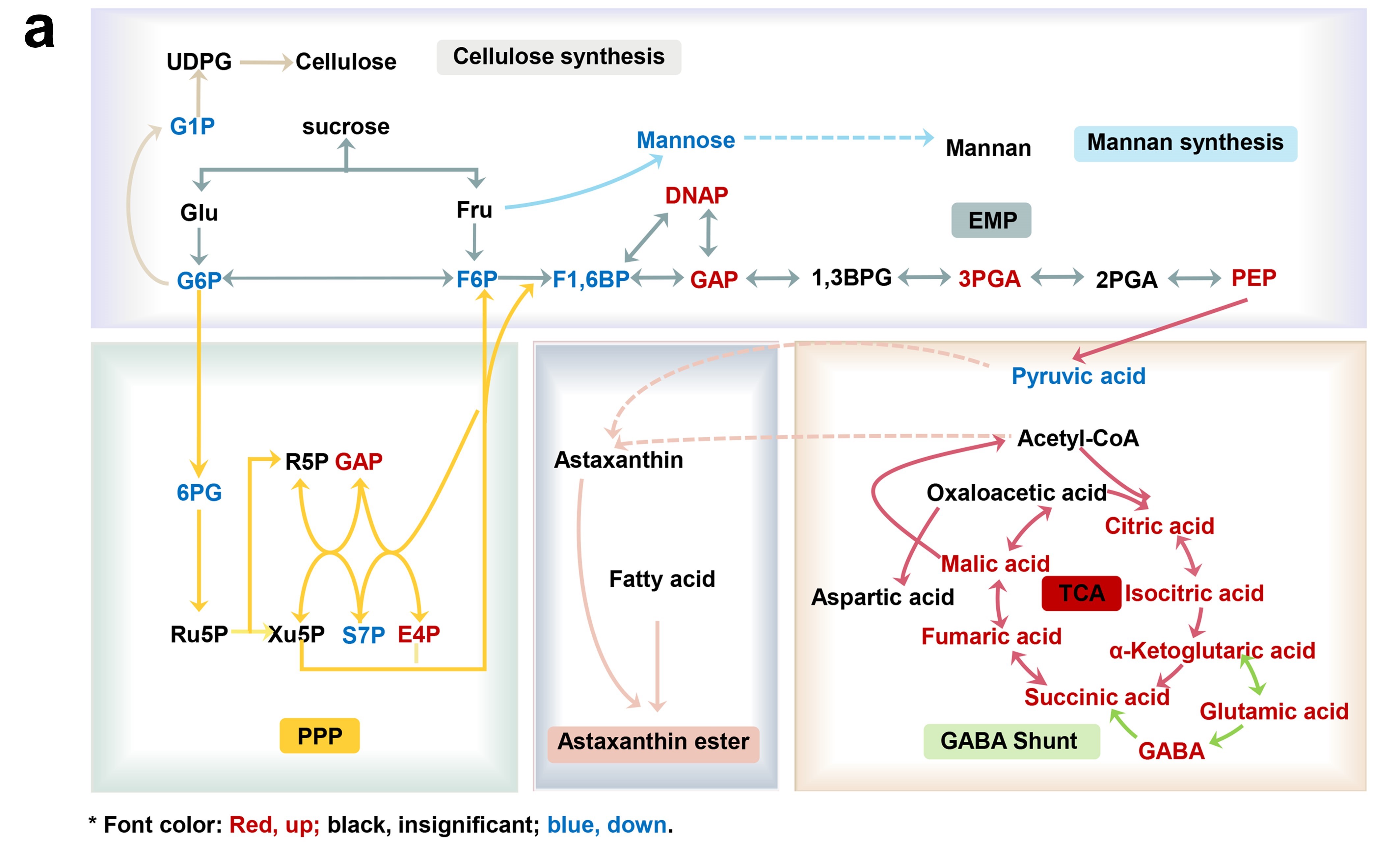 抑制HpOch1基因,红球藻细胞内虾青素合成与主要糖代谢流变化模式图