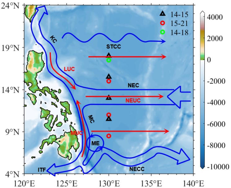 热带西太平洋表层/次表层环流示意图与ADCP 潜标位置。北赤道流/潜流 (NEC/NEUC), 棉兰老流/潜流 (MC/MUC), 黑潮 (KC), 吕宋潜流 (LUC),北赤道逆流 (NECC), 副热带逆流 (STCC), 印尼贯穿流 (ITF), 和棉兰老涡 (ME)
