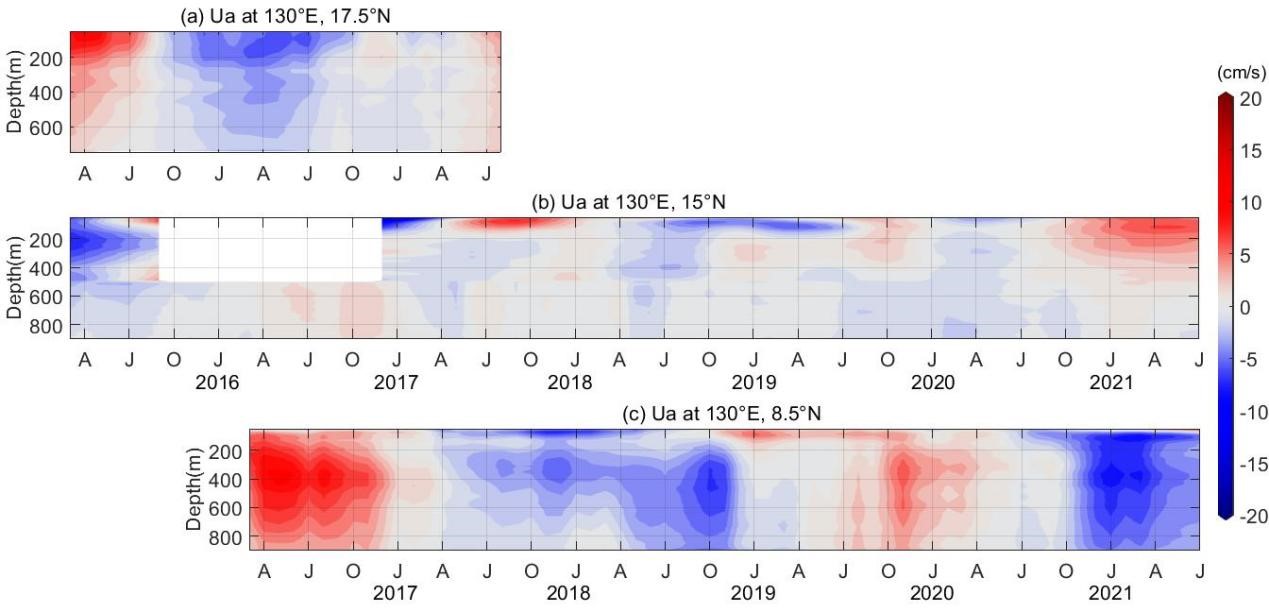 2015年—2021年130 E断面潜标ADCP在(a) 17.5 N,(b) 15 N,和 (c) 8.5 N 观测到的纬向流速异常时间序列,所有时间序列均经过1年低通滤波