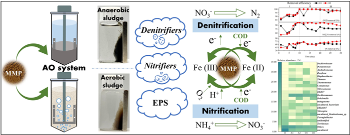 生物脱氮是废水处理中常用的技术,通常由好氧硝化和厌氧反硝化结合实现废水中氮的去除,多种类型的废水尤其是市政污水具有较低的碳氮比(C/N),水体本身碳源不足导致总氮去除率低,而额外添加有机碳源则需要较高的成本。近年来,具有导电性和磁性的四氧化三铁在废水处理领域被广泛研究,尤其是其在低 C/N 条件下促进脱氮的作用机制亟待进一步探讨。