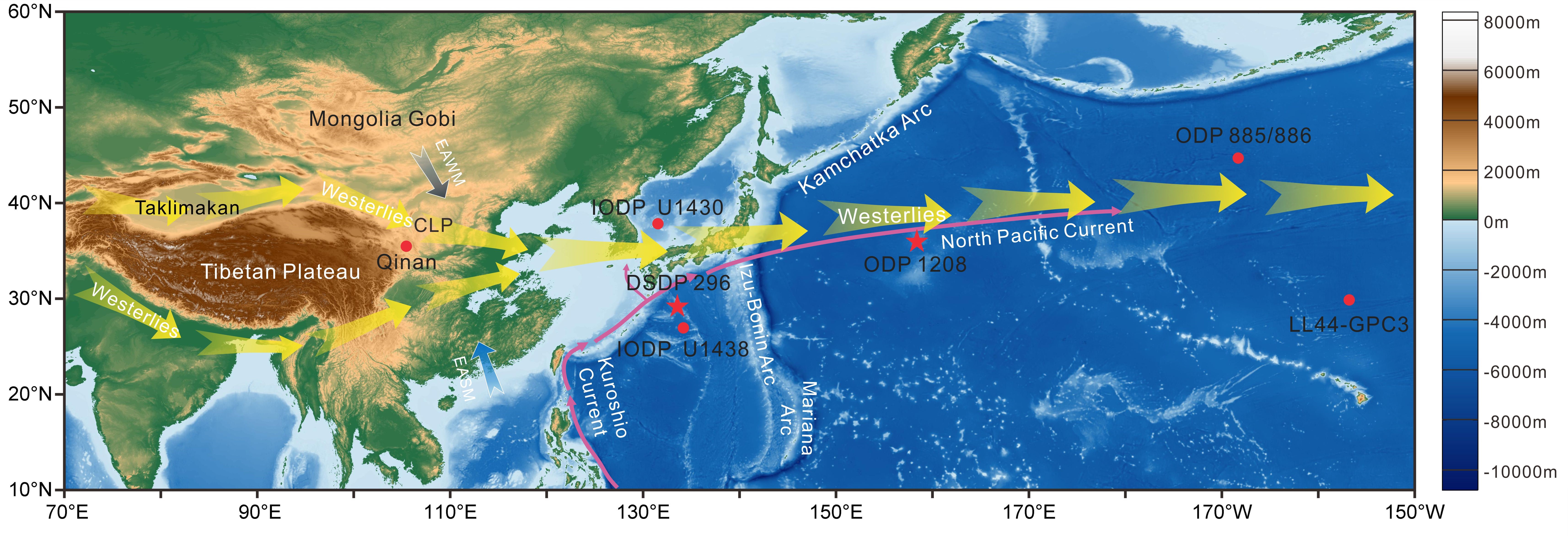 亚洲内陆是全球第二大风尘源区,每年约6亿吨粉尘从这里被扬起,通过西风带或东亚冬季风向东输送,其中大多沉降于陆地成为沙漠或黄土,少部分沉降于西太平洋成为海洋风尘沉积。西太平洋风尘沉积也因此保存了风尘运输途径的重要信息,成为追溯西风演化的重要研究材料。西风带是全球气候系统的重要组成部分,其驱动了中纬度表层洋流,调节了海洋和大气的热量、水汽及碳交换,对区域和全球气候变化有重要影响。目前关于西风带演化历史的研究主要集中在轨道-季节性时间尺度,揭示出西风带在冷期向赤道移动,暖期向极地移动,主要受控于赤道—极地之间的温度梯度。但在更长的构造时间尺度上,中新世以来西风带长期演化历史和驱动机制仍不清楚,我们尤其缺乏对西风带演化是否及如何响应亚洲地形构造隆升的了解。