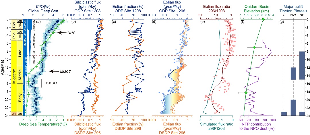 研究人员通过西太平洋风尘沉积记录揭示出北半球西风带在中新世之前靠近北纬30度,在早-晚中新世(23-9百万年前)期间受青藏高原隆升驱动,逐渐向北移动到现今位置(~40 N),随后在长时间尺度上保持相对稳定。研究首次重建了北半球西风带中新世以来的长期演化历史,对于理解全球气候系统演化与高原隆升之间的流固耦合和构造-气候联系有重要意义。