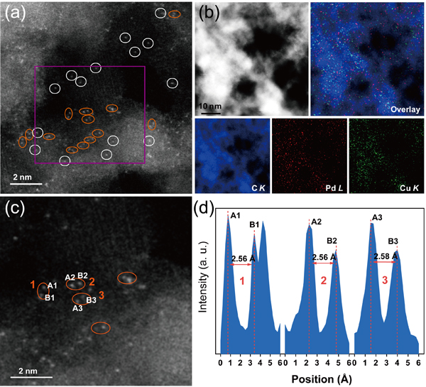 图1 Pd1Cu1/ND@G催化材料的HAADF-STEM表征