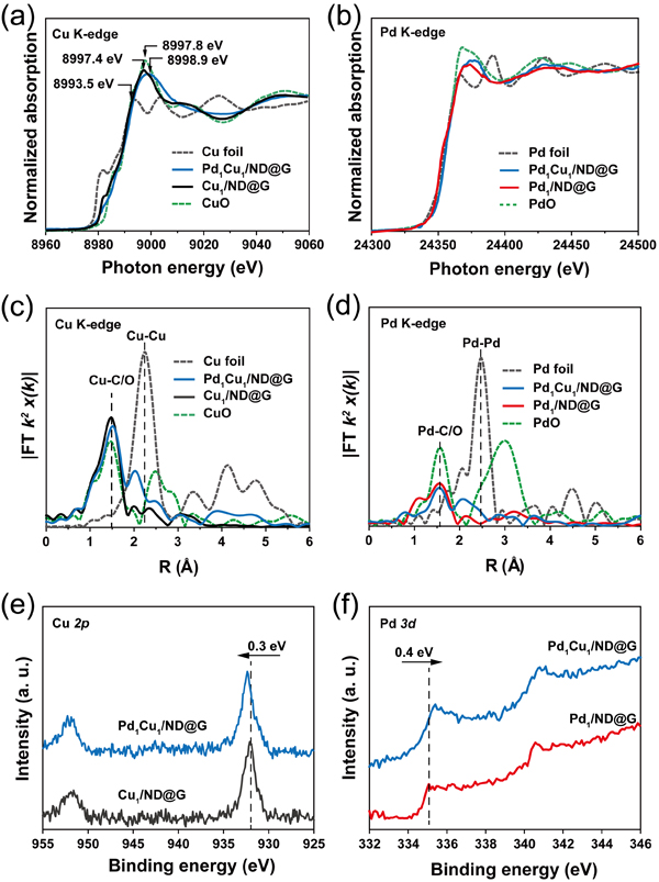 图2 Pd1Cu1/ND@G催化材料的XAFS及XPS谱学表征