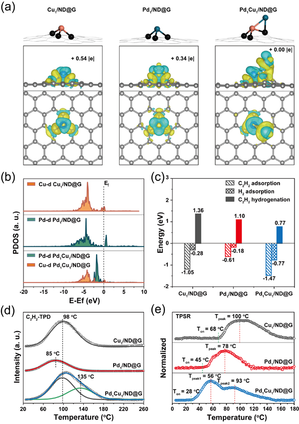 为提高原子级分散金属催化材料的本征加氢活性,通过将金属原子Pd与相邻金属原子Cu进行配位以合理地调控其配位环境成为一个有效的策略。Pd1-Cu1双原子构型将反应中H2和乙炔之间的竞争吸附转化为非竞争吸附,在促进乙炔的吸附的同时,加速氢气的吸附和解离。通过HADDF-STEM(图1)和XAFS(图2)对Pd1-Cu1和Pd1、Cu1进行了结构表征和比较,证明Pd1-Cu1原子对的存在。同时,Pd1-Cu1催化材料中表现出表面电子向Pd物种的偏移。通过电荷密度差和Bader电荷分析(图3a, b, c)表明,Pd-Cu原子之间存在精密的电子耦合。这种耦合作用为H2和乙炔的活化提供了新的活性位点。C2H2-TPD及TPSR(图3d, e)反应机理研究说明,Pd1-Cu1具有更高的吸附乙炔能力和加氢性能。该项研究工作为进一步设计低温高效的乙炔加氢催化剂提供了理论基础。