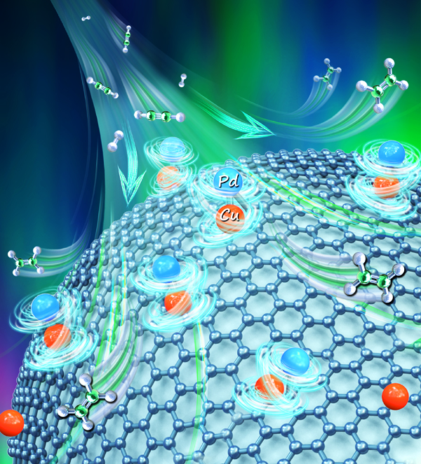 在多相催化中,负载型金属催化材料的活性位点通常会受到周围化学环境的影响,表现出对催化性能的促进或抑制作用。特别是在亚纳米尺度(原子级分散)金属催化材料中,金属活性中心原子周围的配位(近邻)原子通常直接参与或影响催化反应的过程。近日,中国科学院金属研究所沈阳材料科学国家研究中心刘洪阳研究员和特别研究助理黄飞博士与北京大学马丁教授、香港科技大学王宁教授以及中科院山西煤化所温晓东研究员等团队合作,通过精准设计原子级分散金属催化材料的结构,成功构建具有键合的Pd1-Cu1双金属原子(Pd1Cu1/ND@G)。该催化剂在较低温度下可实现乙炔分子完全转化,并表现出优异的乙烯选择性。相关研究成果以“Low-temperature Acetylene Semi-Hydrogenation over the Pd1-Cu1 Dual-Atom Catalyst”为题于近日以封面文章发表在Journal of the American Chemical Society上。