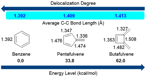 Kekul 在1865年提出苯环单、双键交替排列、无限共轭的结构,即“凯库勒式”结构,随后,芳香化合物在有机化学发展过程中得到了广泛的关注和研究。作为苯环的构造异构体,丁富烯(Butafulvene)的四元全碳环结构使其具有反芳香性的性质,并且这种分子相对苯环具有较高的能量(62.0kcal/mol)。但由于其巨大的环张力及反芳香性,此分子的合成通常面临条件苛刻、步骤经济性差、合成效率低等问题。另一方面,由于反芳香性的化合物通常都不太稳定,也造成了很多反芳香性化合物的研究比较有限。