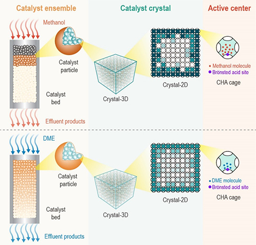 近日,中国科学院大连化学物理研究所低碳催化与工程研究部中国工程院院士刘中民、研究员魏迎旭团队在甲醇制烯烃(MTO)反应机理研究中取得新进展,揭示了SAPO-34分子筛催化甲醇和二甲醚转化过程中反应—扩散—催化剂之间的多尺度动态交互作用机制,涵盖了从菱沸石(CHA)笼或分子尺度,到单个催化剂晶体尺度,再到催化剂床层尺度的动态行为。