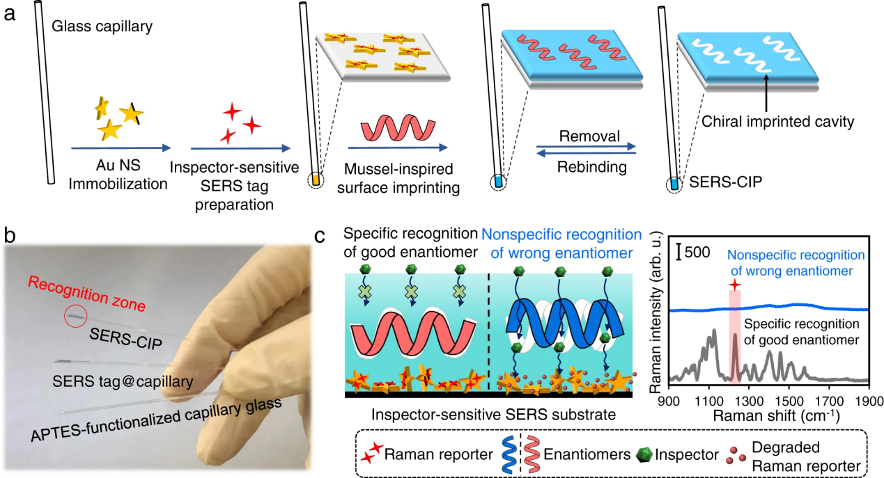 图1. a) SERS-CIP检测策略示意图;b)含SERS标记物的SERS-CIP玻璃毛细管照片,识别区域用红色圆圈表示;c)在SERS-CIP上实现手性氨基酸识别检测原理