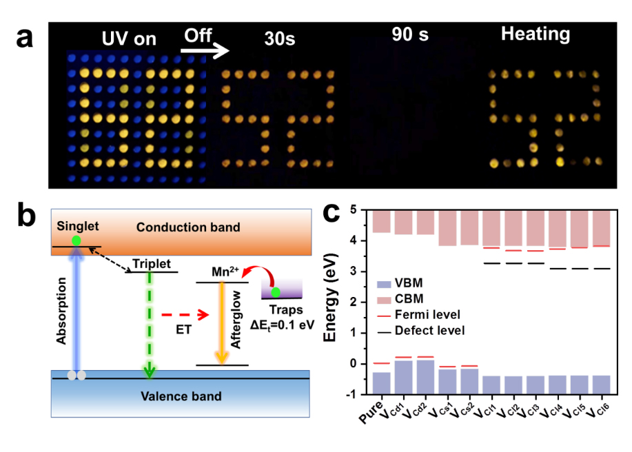 本工作中,科研人员发展了基于三线态自陷激子(STE)到受体Mn2+能量转移的发光策略,以溶液处理的钙钛矿CsCdCl3单晶作为余辉基质,通过Mn2+掺杂策略,制备出了高效超长抗热淬灭余辉发射荧光体,可以同时实现高发光量子产率(81.5%)和超长余辉时间(150秒)。科研人员进一步通过深入的载流子动力学研究和密度泛函理论(DFT)计算为发光机制提供了明确的证据:研究发现CsCdCl3:Mn2+结构具有面共生(C3v对称性)和角共生(D3d对称性)的[CdCl6]4-八面体,可以形成不等价的Cl空位,从而产生具有广泛能量分布的陷阱态。这些陷阱态可以储存电荷载流子,并将它们缓慢地释放到发射中心([MnCl6]4-八面体),从而产生具有反热淬灭效应的余辉发射。此外,科研人员证明了余辉发射持续时间与主要由Cl空位引起的深陷状态的数量有正相关的关系,这可能有助于通过材料和陷阱工程进一步设计颜色可调控和更长的余辉材料。