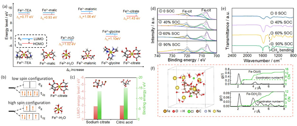 图1 (a-c) 配体量子化学计算筛选;(d-e) XPS与FTIR分析;(f) Fe2+-citrate络合物溶剂化结构DFT-MD计算