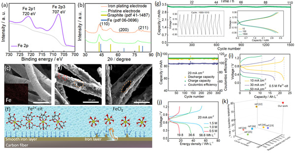 图2 (a-b) 铁沉积界面成分分析;(c-e) 不同配体作用下铁沉积形貌;(f) 配体引入前后铁沉积过程机理示意图;(g-k) 电池性能综合评测