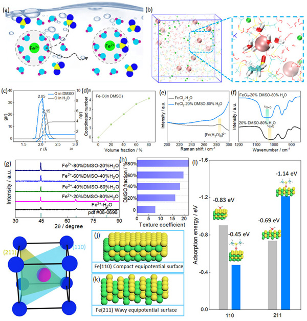 图3 (a) DMSO改变Fe2+溶剂化壳层的过程示意图; (b-d) 分子动力学模型与径向分布函数图;(e-f) 铁负极溶液光谱分析;(g-h) 晶体结构分析与表征;(i-k) 不同晶面吸附能计算结果
