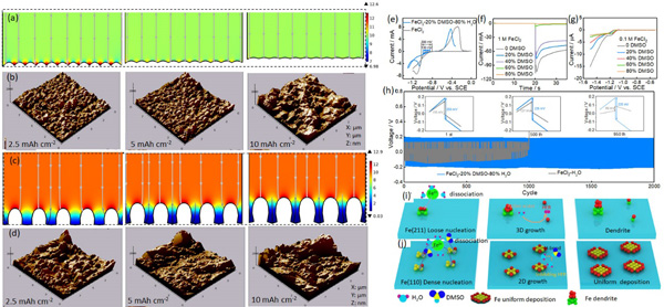 图4 (a-d) 极性溶剂作用下的铁沉积有限元仿真与AFM表征;(e-g) 电化学分析结果;(h) 对称电池测试结果;(i-j) 极性溶剂优化铁均匀沉积原理图