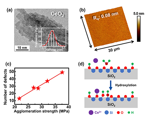 本工作中,研究人员制备出一类尺寸小、粒度分布窄的超细纳米CeO2抛光浆料,其平均一次粒径小于4nm。通过CMP技术参数的调控和优化,研究人员实现了表面粗糙度(RMS)小于0.1nm的极低缺陷石英光学表面的加工。对比研究发现:石英元件表面粗糙度主要受CeO2一次粒径尺寸和粒度分布影响,一次粒径尺寸越小,粒度分布越窄,越有利于超光滑表面的形成;从“CeO2团聚强度”这一全新的角度,阐释了CeO2团聚强度是影响石英元件表面亚微米尺寸缺陷形成的关键因素。此外,通过对石英元件抛光去除速率以及表面接触角的分析,研究人员提出了CeO2浆料中Ce3+促进石英表面羟基形成进而提升抛光去除速率的化学去除模型。