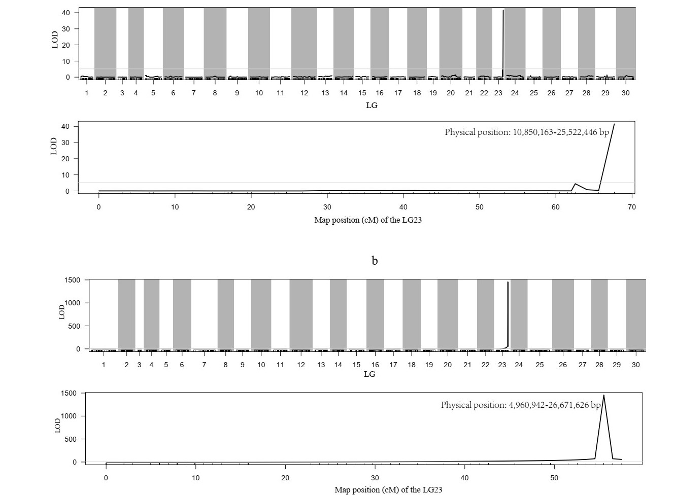 海藻种质库研究人员将具有雌雄同体表型的单倍配子体与雌性单倍配子体进行杂交获得孢子体,经减数分裂后大规模构建了子代单倍配子体克隆家系。以前期完成的裙带菜基因组为参考,利用重测序技术开发多态性SNP标记并构建高密度遗传图谱。由此发现62个SNP与性别性状紧密连锁,它们位于23号连锁群67.67 cM的位置,对应于23号染色体的一段长度为14.67 Mbp的物理区间。