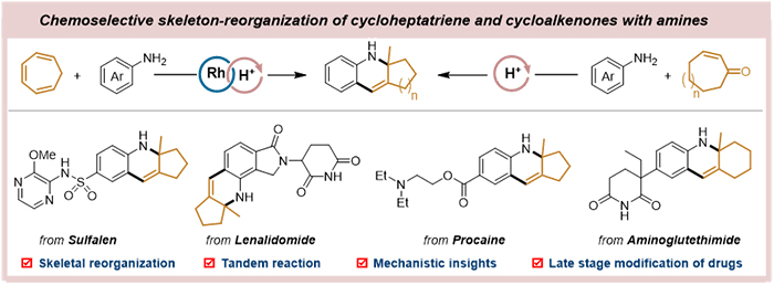 陈庆安团队一直致力于发展不同催化体系,以实现烯烃、炔烃的精准转化。在前期相关研究的基础上(Angew. Chem. Int. Ed.,2019;Angew. Chem. Int. Ed.,2020;Angew. Chem. Int. Ed.,2021;Angew. Chem. Int. Ed.,2021;Angew. Chem. Int. Ed.,2021;Nat. Commun.,2021;Angew. Chem. Int. Ed.,2022;Nat. Chem.,2022;Nat. Catal.,2022),本工作中,该团队利用铑/酸协同催化体系,实现了环庚三烯的选择性氢胺化反应,生成含并环结构的1,2-二氢喹啉化合物。机理研究表明,该反应先后经历了连续氢胺化、逆-Mannich开环以及Povarov环化,实现全碳环骨架重构的过程。在反应机理的指导下,该团队发现,如果以环烯酮为反应原料,在简单盐酸的催化下也可以实现该类产物的合成。该研究为环状分子的骨架编辑与重排反应提供了新的思路。