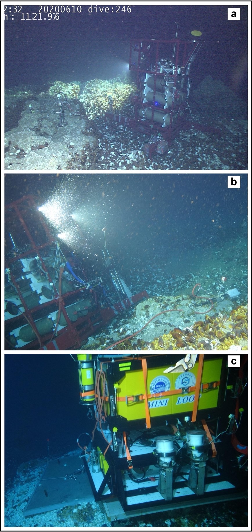 为了明确甲烷在深海冷泉喷口附近的转换通道以及冷泉区域的甲烷释放通量,研究团队使用深海多通道拉曼光谱探测系统搭载深海坐底长期观测系统(Long-term ocean observation platform, LOOP)于2020年、2021年、2022年前后3次布放于我国南海北部的台西南冷泉区域(如图4),实现了冷泉喷口流体中主要成分、天然气水合物与深海环境的耦合变化过程、冷泉生物群落内部甲烷氧化过程的长期原位探测与现场实验,成功建设国际首套深海原位光谱实验室,并在深海冷泉、热液等区域常态化运行。