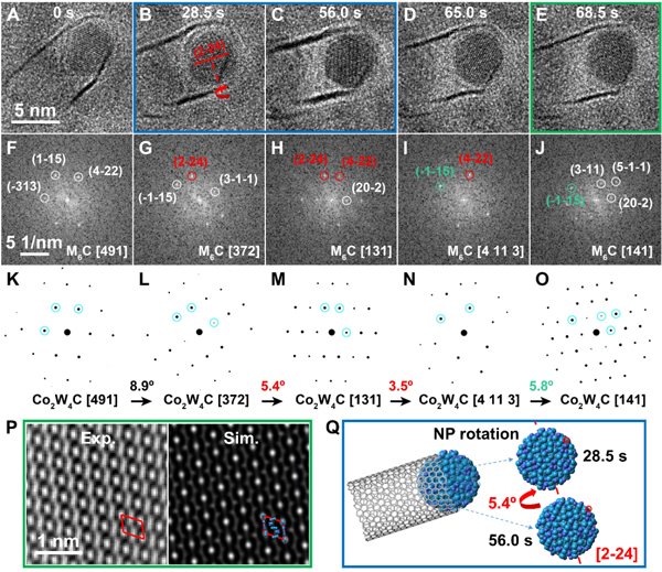 图2.单壁碳纳米管生长过程中Co-W-C合金催化剂纳米颗粒的物相结构表征。(A-E)单壁碳纳米管生长过程中催化剂纳米颗粒的时间序列HRTEM图;(F-J)对应的FFT花样;(K-O)对应的模拟电子衍射花样(以Co2W4C为例);(P)图E的傅里叶过滤HRTEM图和对应的模拟HRTEM图;(Q)图B,C中纳米颗粒转动的原子模型图。