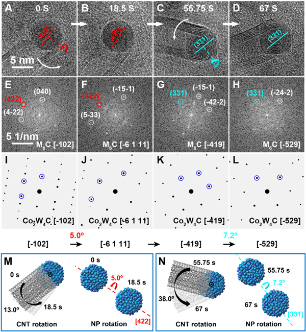 图3.Co-W-C合金催化剂纳米颗粒在碳纳米管生长过程中的取向转动。(A-D)碳纳米管生长过程中纳米颗粒的时间序列HRTEM图。碳纳米管的转动方向用白色弧形箭头表示,纳米颗粒的转动方向用红色和青色弧形箭头表示;(E-H)对应的FFT花样;(I-L)对应的模拟电子衍射花样(以Co2W4C为例);(M,N)图A-D中碳纳米管和纳米颗粒转动的原子模型图,碳纳米管的摆动方向用黑色弧形箭头表示,纳米颗粒的转动方向用红色和青色弧形箭头表示。