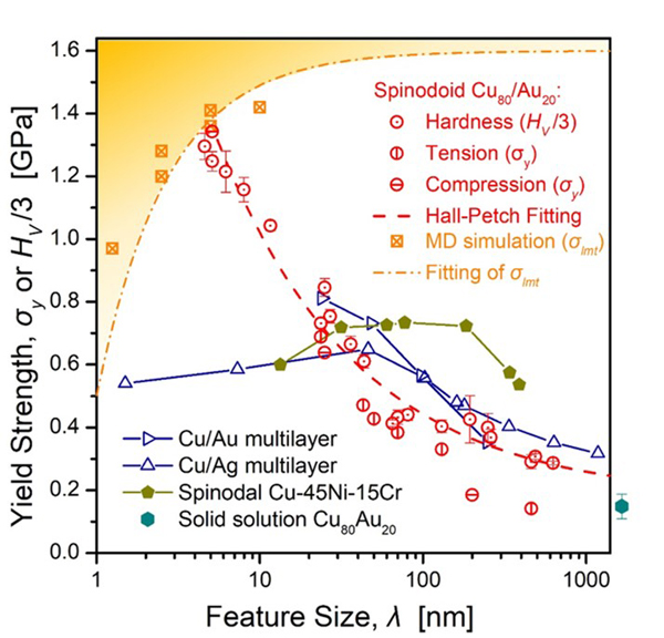 图4 仿调幅分解结构Cu/Au合金屈服强度的晶粒尺寸效应。a)虽然该材料晶粒尺寸(d)比结构尺寸(