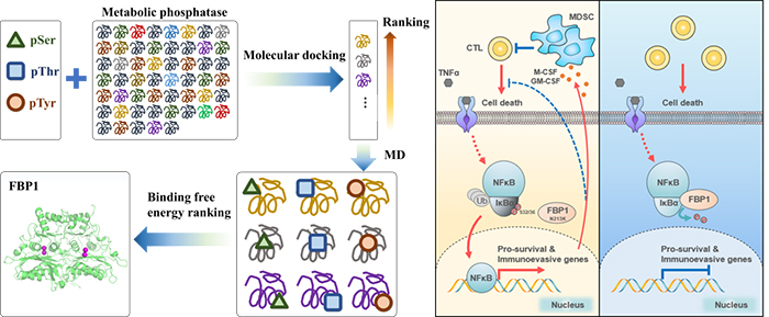 近日,中国科学院大连化学物理研究所分子反应动力学国家重点实验室分子模拟与设计研究组研究员李国辉团队与中国科学院分子细胞科学卓越创新中心(上海生物化学与细胞生物学研究所)研究员杨巍维团队、广州大学教授王雄军、复旦大学附属中山医院教授李全林等合作,揭示了代谢酶果糖1,6-二磷酸酶1(FBP1)能够行使蛋白磷酸酶的功能,并证明了FBP1介导的I B 去磷酸化在结直肠癌发生中起到关键作用。