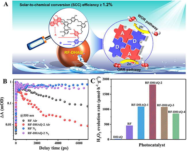本工作中,该团队提出从分子尺度设计调控RF树脂中电子供体(D)与电子受体(A)比例的策略,将缺电子的1,4-二羟基蒽醌(DHAQ)分子引入到RF的骨架中。研究发现,DHAQ作为电子受体可以有效调节RF中的D/A比例,增强其电荷分离能力,同时调整了反应路径,通过水氧化和氧还原的双路径共同生产H2O2,使得该材料展现优异的光催化生产H2O2的催化活性,SCC效率达到1.2%,是目前文献报道最高的SCC效率。此外,团队与大连化物所超快时间分辨光谱与动力学研究组合作,结合飞秒瞬态吸收光谱等技术、原位表征实验以及理论计算模拟,阐析了DHAQ掺杂的RF树脂的微观结构以及促进电荷分离和双路径生产H2O2的机制。上述研究成果为在分子水平上设计高效人工光合作用的聚合物光催化剂提供了新思路。