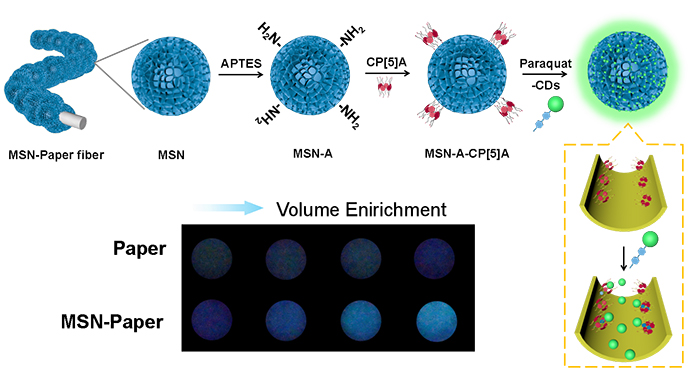 近日,中国科学院大连化学物理研究所化学传感器研究组研究员冯亮团队在纸基光化学传感器的信号放大研发中取得新进展。团队构建了新型介孔二氧化硅功能化纸基传感器,通过柱芳烃超分子识别系统,实现了农药百草枯的高效捕获和分析。该工作为纸基光化学传感器痕量食品安全危害因子快速筛查技术的产业化应用提供了新的思路。