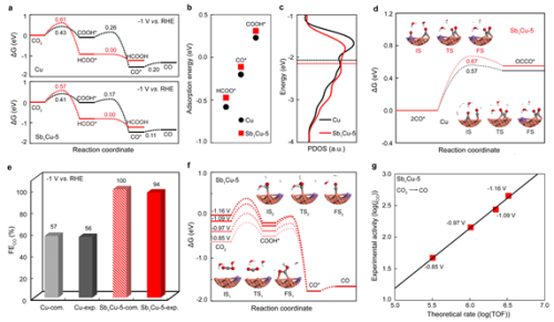 本工作中,肖建平团队探究了单原子合金催化剂Sb1Cu电催化CO2还原表现出高CO选择性的原因。研究发现,Sb1Cu电催化CO2到CO的活性位为与单原子Sb相邻的Cu位点,并揭示了Sb1Cu相比于Cu可以有效减弱CO*的吸附能,降低CO*的覆盖度,抑制C-C偶联反应,从而提升了CO的选择性。通过电荷外插值法,肖建平团队计算了不同工作电势下的反应能垒,通过微观动力学模拟得到的理论速率也和实验结果有较好的吻合。该研究为设计高活性和特定选择性电催化材料提供了新思路。