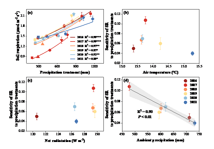图1 2016-2021年不同降雨处理下的土壤呼吸和年降雨量之间的指数回归(a),以及土壤呼吸对降雨处理敏感性与气温(b)、净辐射(c)和降雨(c)的关系