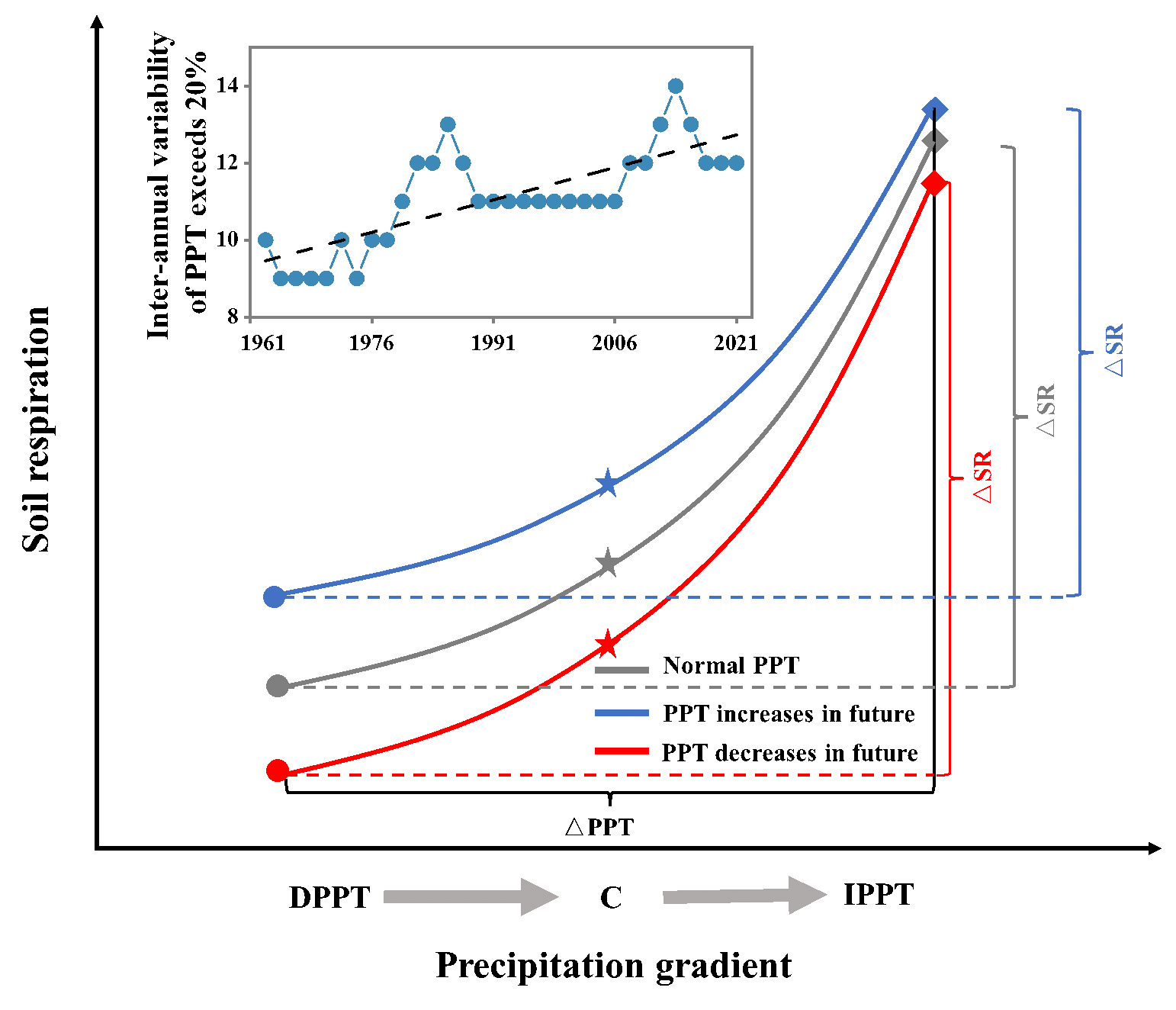 图2 预测未来土壤呼吸( SR)随降雨( PPT)梯度变化的概念模型