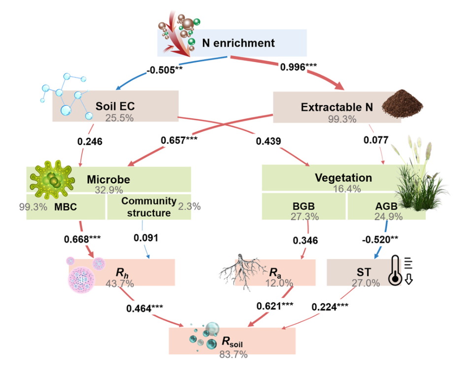 图4 结构方程模型(SEM)描述了富氮对土壤呼吸(Rsoil)的影响机制