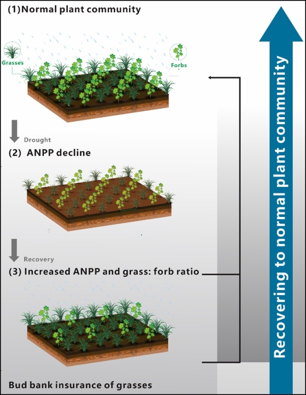 为此,沈阳生态所生态化学计量组研究团队以北方温带草甸草原为研究对象,基于额尔古纳站的长期极端干旱控制实验平台,在连续4年极端干旱处理基础上开展自然恢复实验,探讨极端干旱诱导的遗留效应对植物群落结构和功能的影响。研究发现极端干旱处理停止后的两年内,处理小区地上生产力可恢复至对照水平。进一步基于植物芽库动态和克隆性状的视角,探讨极端干旱条件下草原植物群落结构和功能恢复力形成和维持机制。长期干旱导致禾草、杂类草及群落总生物量降低,资源竞争压力得以缓解,释放出一定的生态位空间。极端干旱条件下禾草地下芽库储备充足,恢复过程中其芽库迅速萌蘖,对地上分株种群进行有效补充,抢占生态位空间,促使禾草功能群的繁盛。相反,极端干旱后杂类草地下芽库明显低于自然水平,地上分株种群补员不足、更新受限,导致杂类草功能群的衰退。该结果有助于准确认识干旱对北方温带草原生态系统结构与功能的影响机制,进而对实现草原生产和生态功能的可持续利用具有重要科学意义。